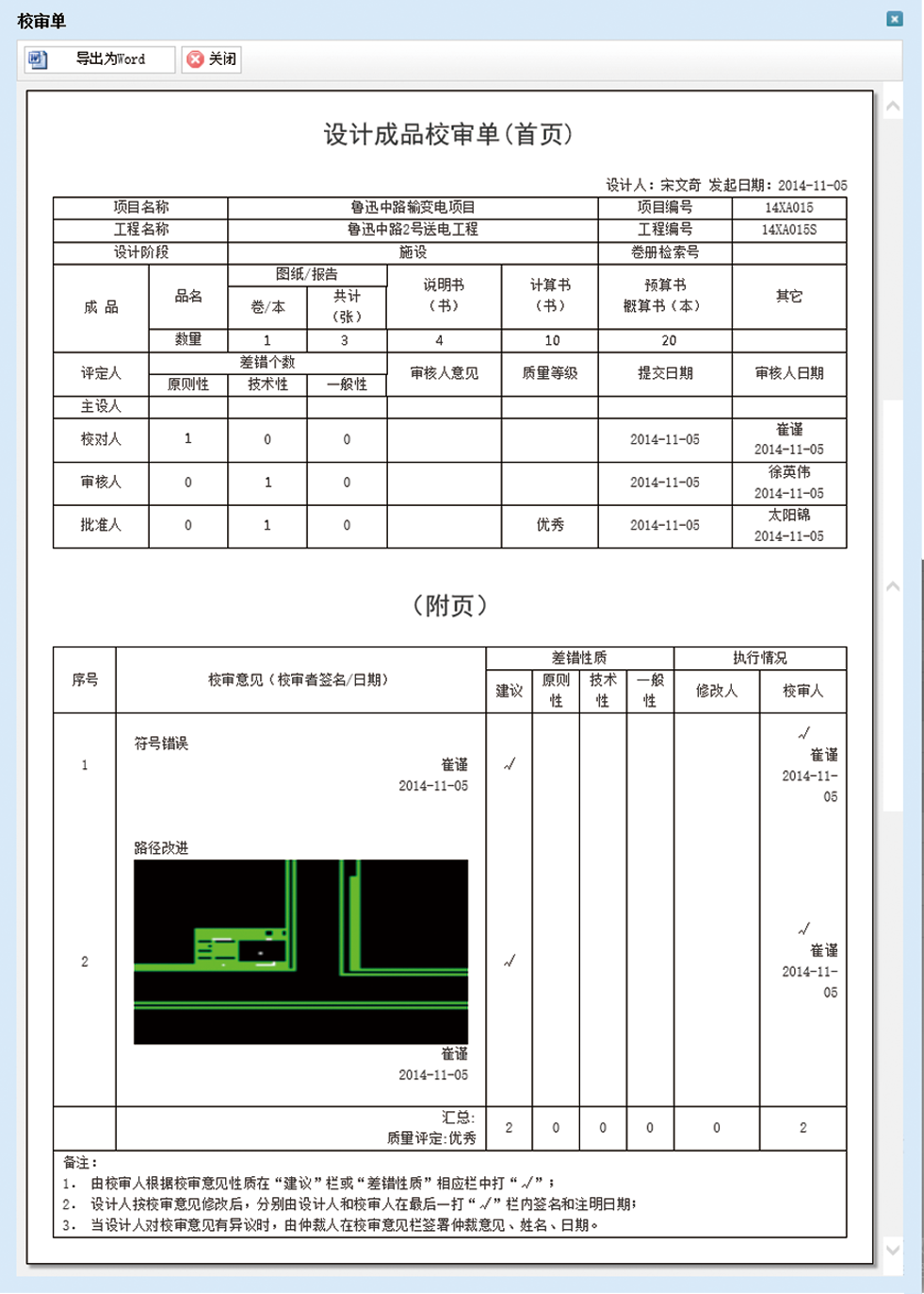 在設(shè)計協(xié)同過程中,校審人員可以基于這個協(xié)同平臺,進行電子校審,填寫校審意見,自動生成符合ISO貫標要求的電子校審單,并對校審出來的差錯和質(zhì)量等級進行統(tǒng)計匯總。校審過程可以反復(fù)進行,各校審環(huán)節(jié)可以進行意見的互動,校審流程中的各人員從而得以相互配合,協(xié)同工作。
