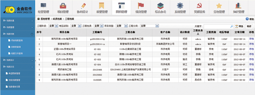由相關(guān)人員登記項目歸檔清單,包含電子部分、紙質(zhì)部分內(nèi)容,電子部分內(nèi)容可自動或手動關(guān)聯(lián)相關(guān)表單、收資文件、項目記事等信息,紙質(zhì)部分則可自行填寫。