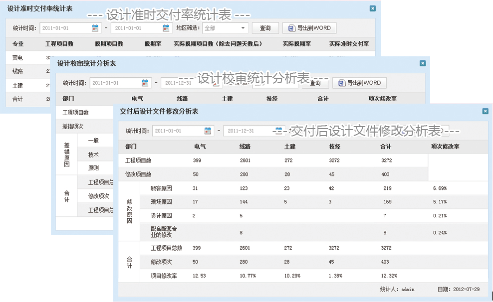 相關(guān)人員可填寫設(shè)計變更申請表,并提出申請,進行流轉(zhuǎn)審批??蓪崟r查詢項目中所有的項目變更表,對變更單中涉及的修改文件進行校審。系統(tǒng)自動按人、按部門統(tǒng)計變更類型及數(shù)量。
